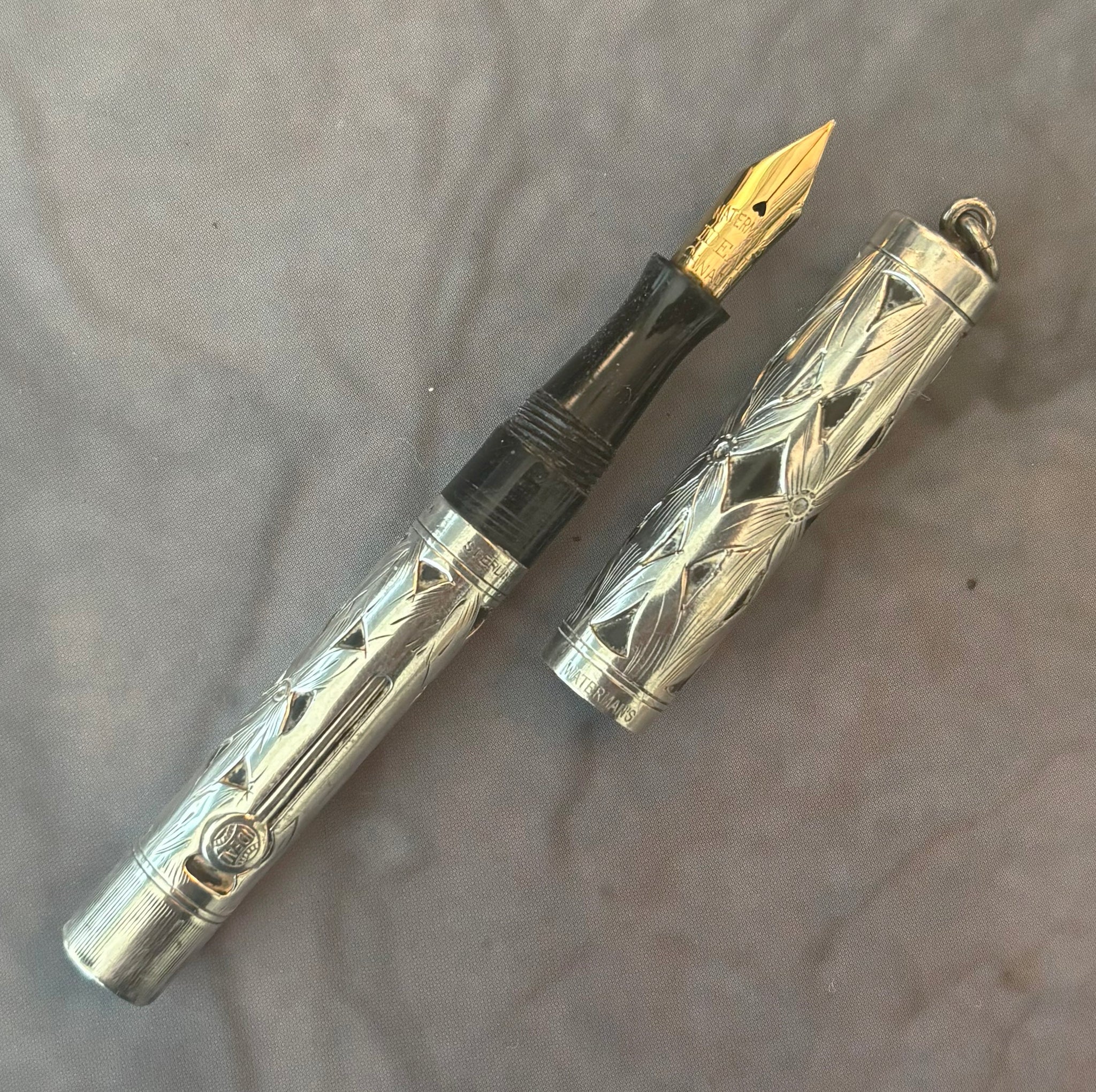 Waterman 452 1/2 V Fountain Pen & Pencil - Fully Etched Sterling