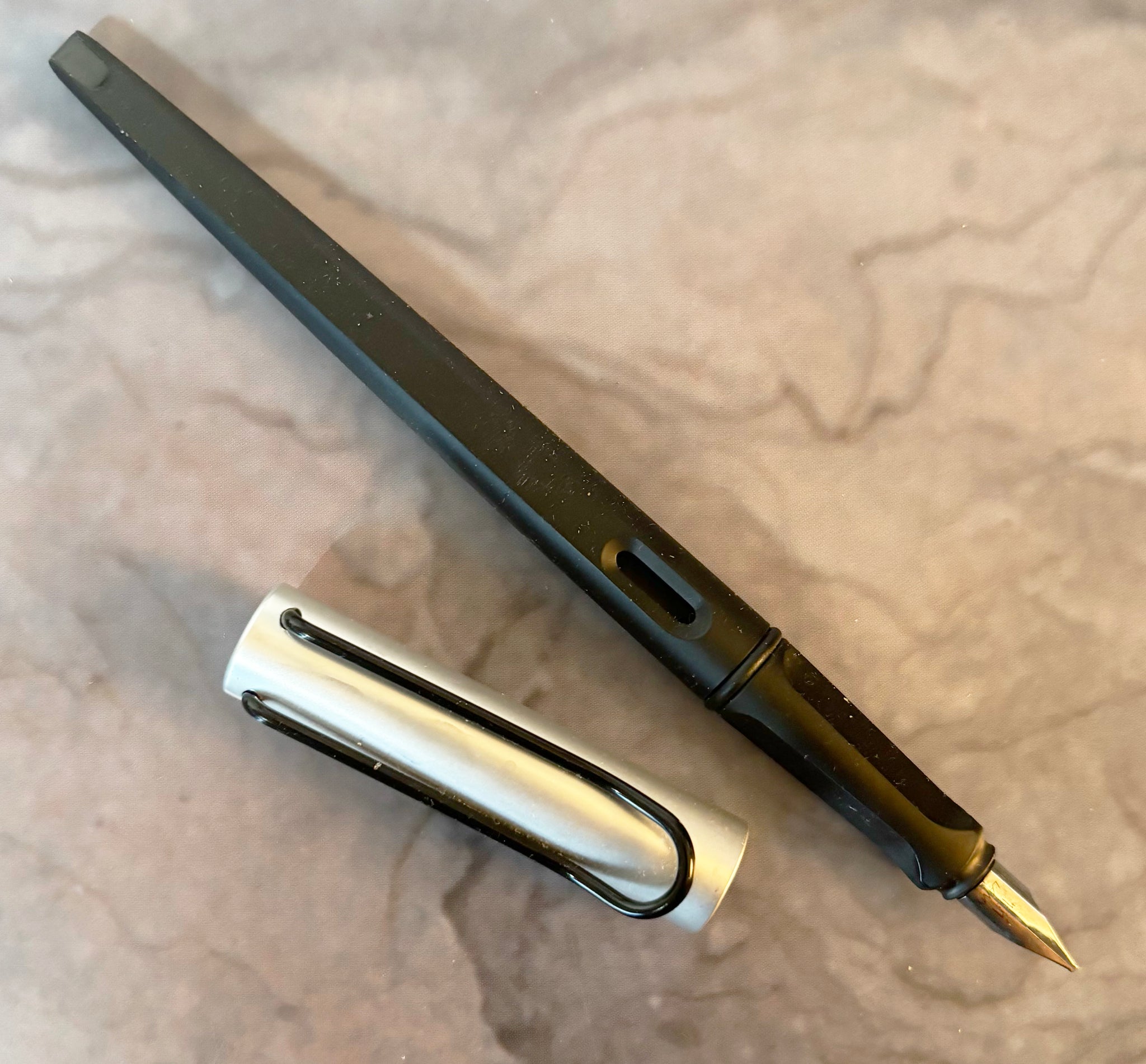 The Lamy Joy AL Calligraphy fountain pen is made from plastic with a soft black lacquer finish and a silver color aluminum cap. The pen has an ergonomic grip, a flexible spring clip and an italic stainless steel nib making it perfect for calligraphy writing on letters, invitations, menus, certificates and more.