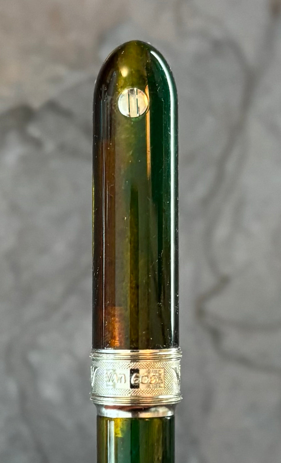 The pen is made of Italian resin that is semi-transparent, the musk green colour with its swirls of yellow, orange, and brown. The resin is stunning and changes with the light Rhodium-plated adornments accent the pen. The clip has the usual Visconti name on each side, and it is fully functional. The cap is encircled at the bottom with a thick band that is engraved with "Visconti" and "Van Gogh" along with decorative texture.