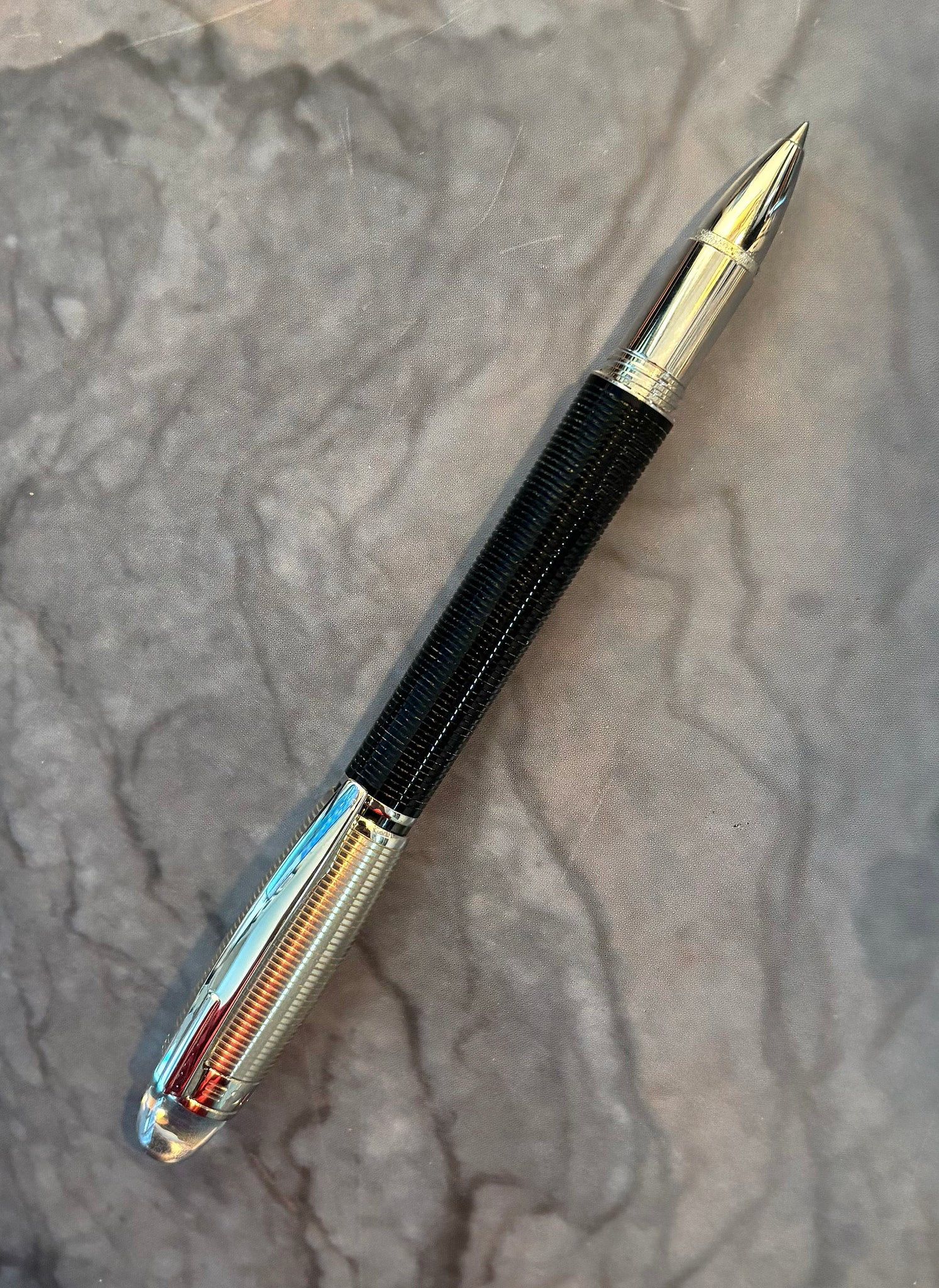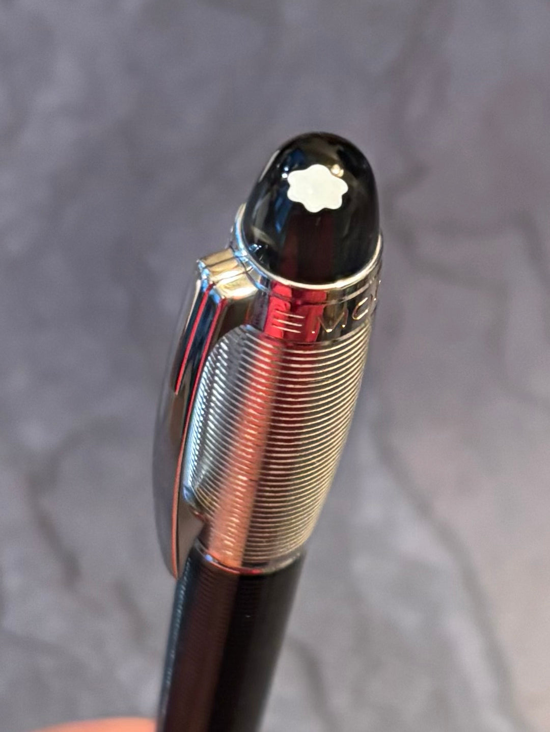 Black precious resin and platinum with horizontal Guilloche pattern. Floating Montblanc emblem in transparent cap top. High polished Platinum plated clip with individual serial number.