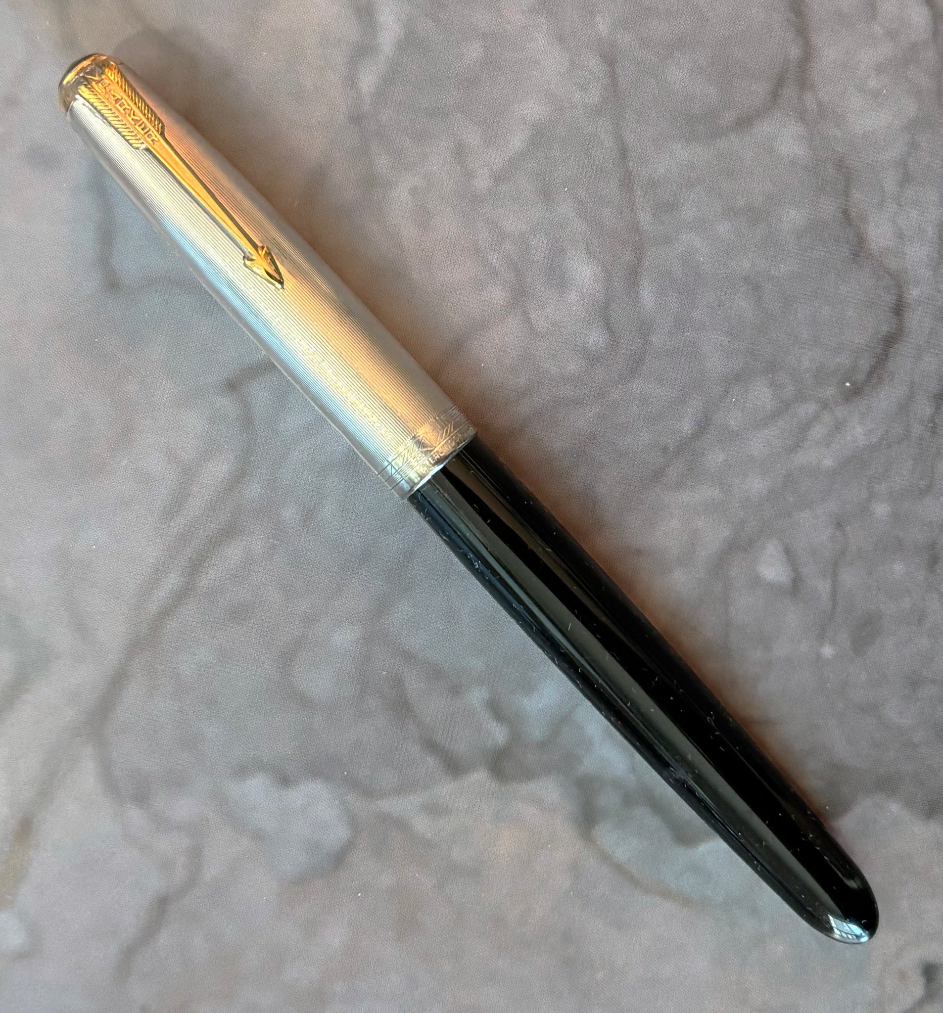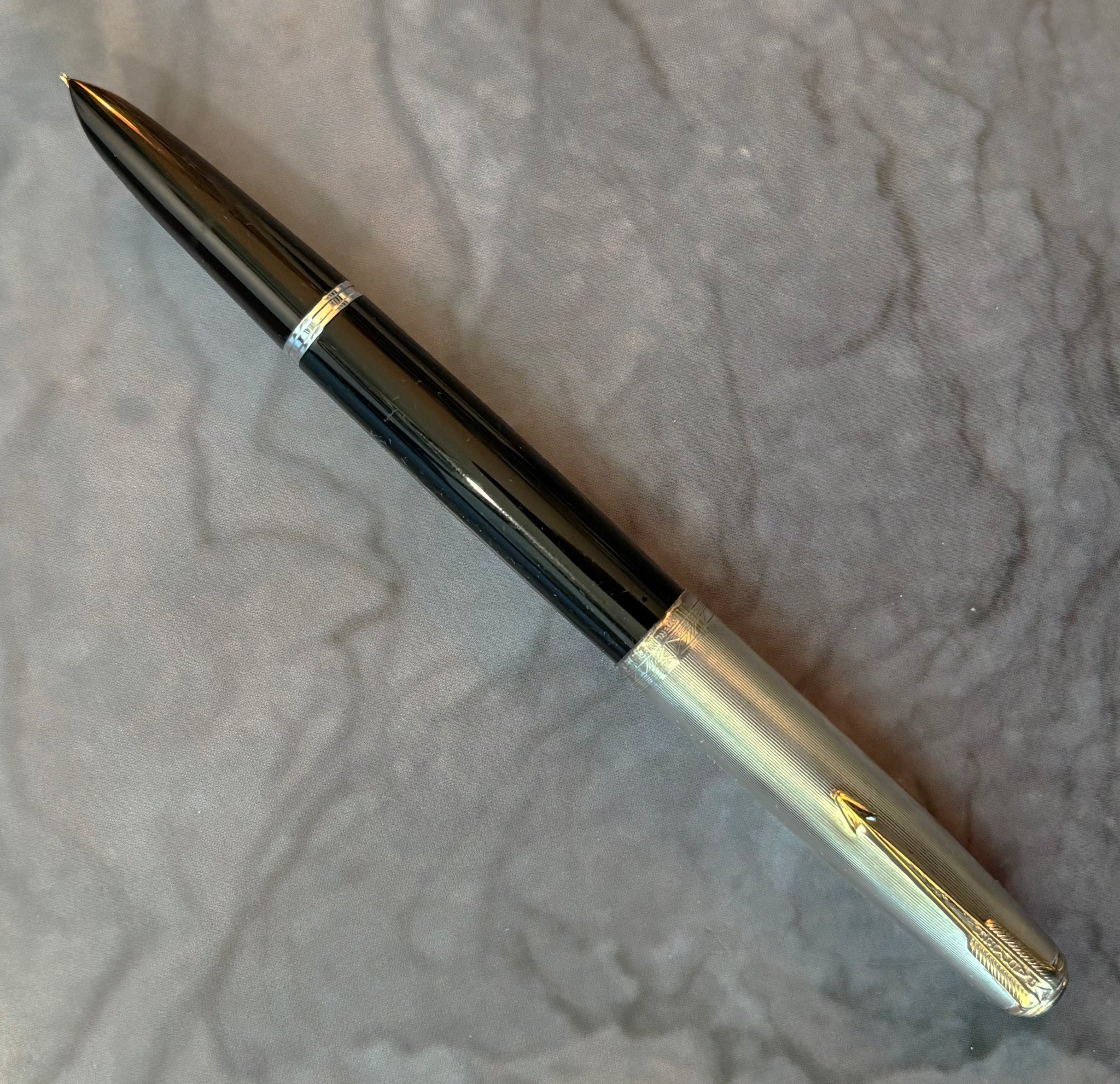 1948 Parker 51 Fountain Pen Silver cap with thin lined engraving Arrow Clip with Black Coloured Jewel Filler sleeve, metal Aerometric, one piece Made in USA