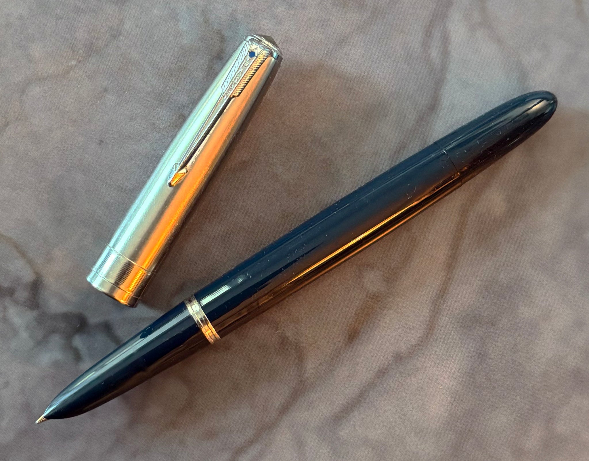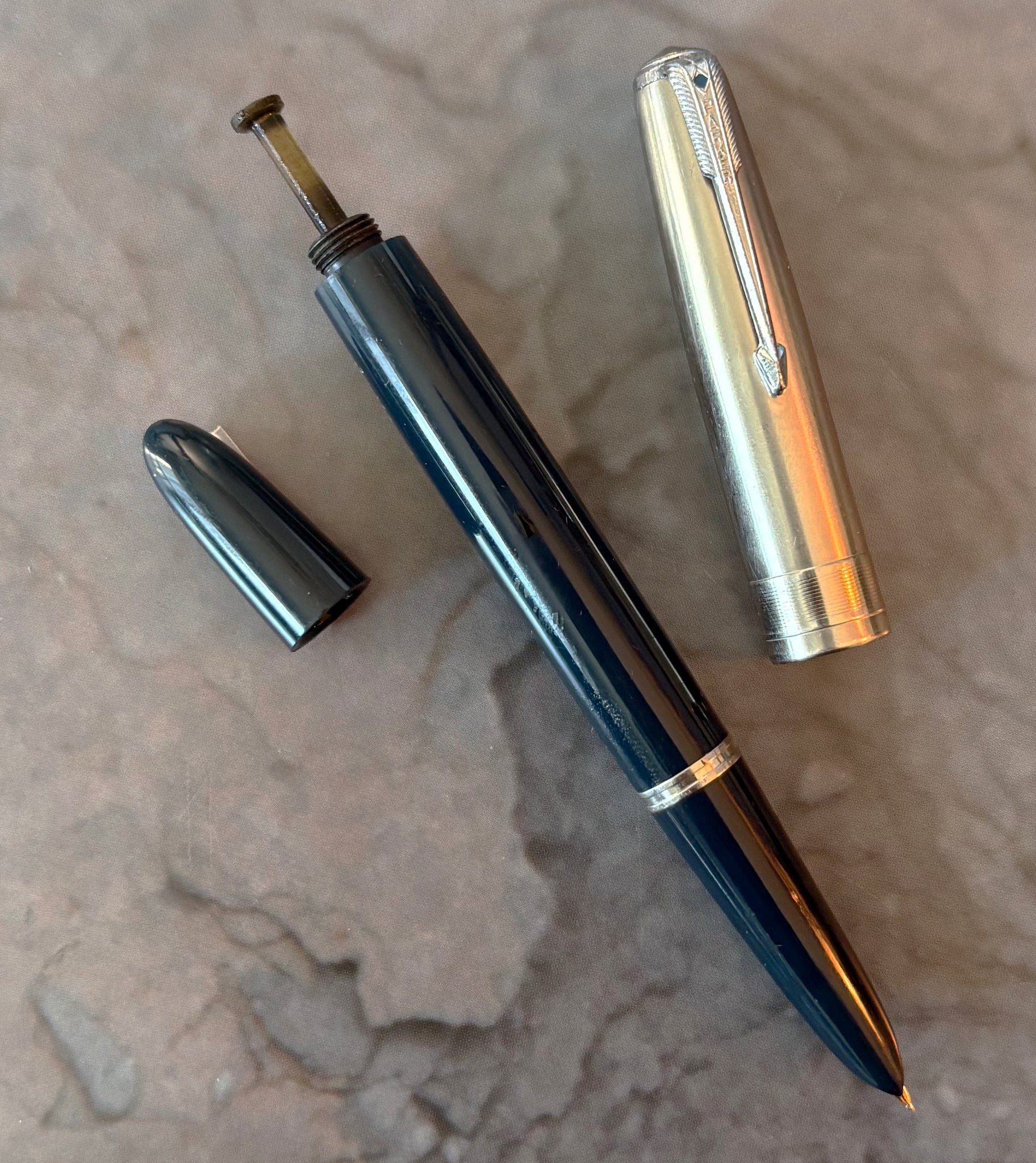 Parker 51 Vacumatic Fountain Pen (1940's) Navy Blue w/ Lustraloy Cap, (Large band) Silver Split Arrow clip with a blue diamond. Pearlescent cap jewel.