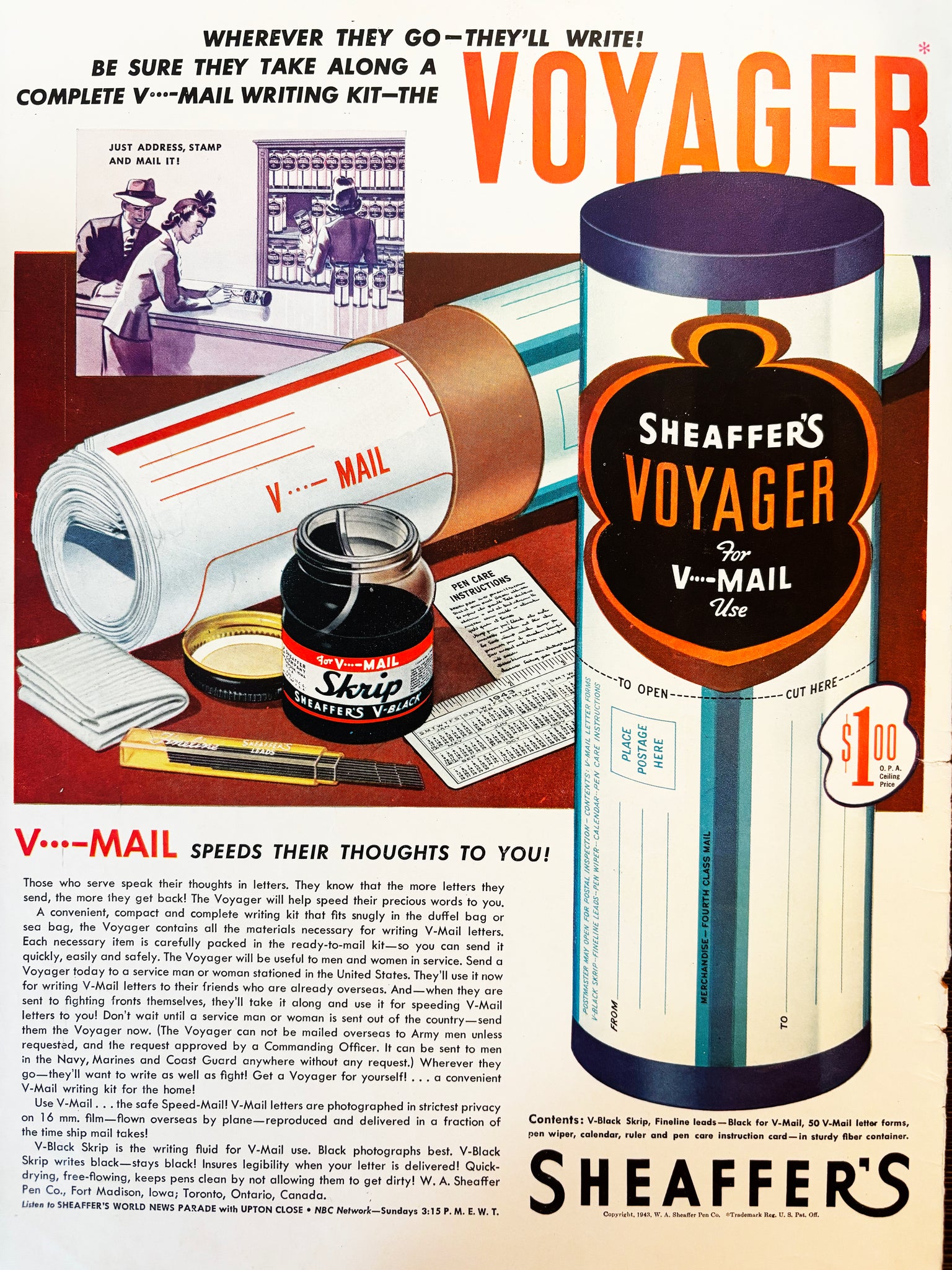 DescriptionThis unopened, “Sheaffer’s Voyager” cylindrical cardboard tube holds V-mail stationery. The text above the blank mailing label lists the canister’s contents: “Postmaster may open for postal inspection – contents: V-mail letter forms – 2 oz. v-black Skrip -- Fineline leads – pen wiper – calendar – pen care instructions.”The Sheaffer Pen Company manufactured specialty inks during World War II for use with V-mail. After being filled out, stationery forms for V-mail (victory) underwent a microfilming process in efforts to control mail volumes being sent to troops overseas. Nearly 2000 letters could be reduced and fit on a single roll of 16mm film. The rolls were flown to receiving stations for processing where individual facsimiles of the letter sheets were then reproduced at a quarter of the original size. The miniaturized mail was then delivered to its destination.