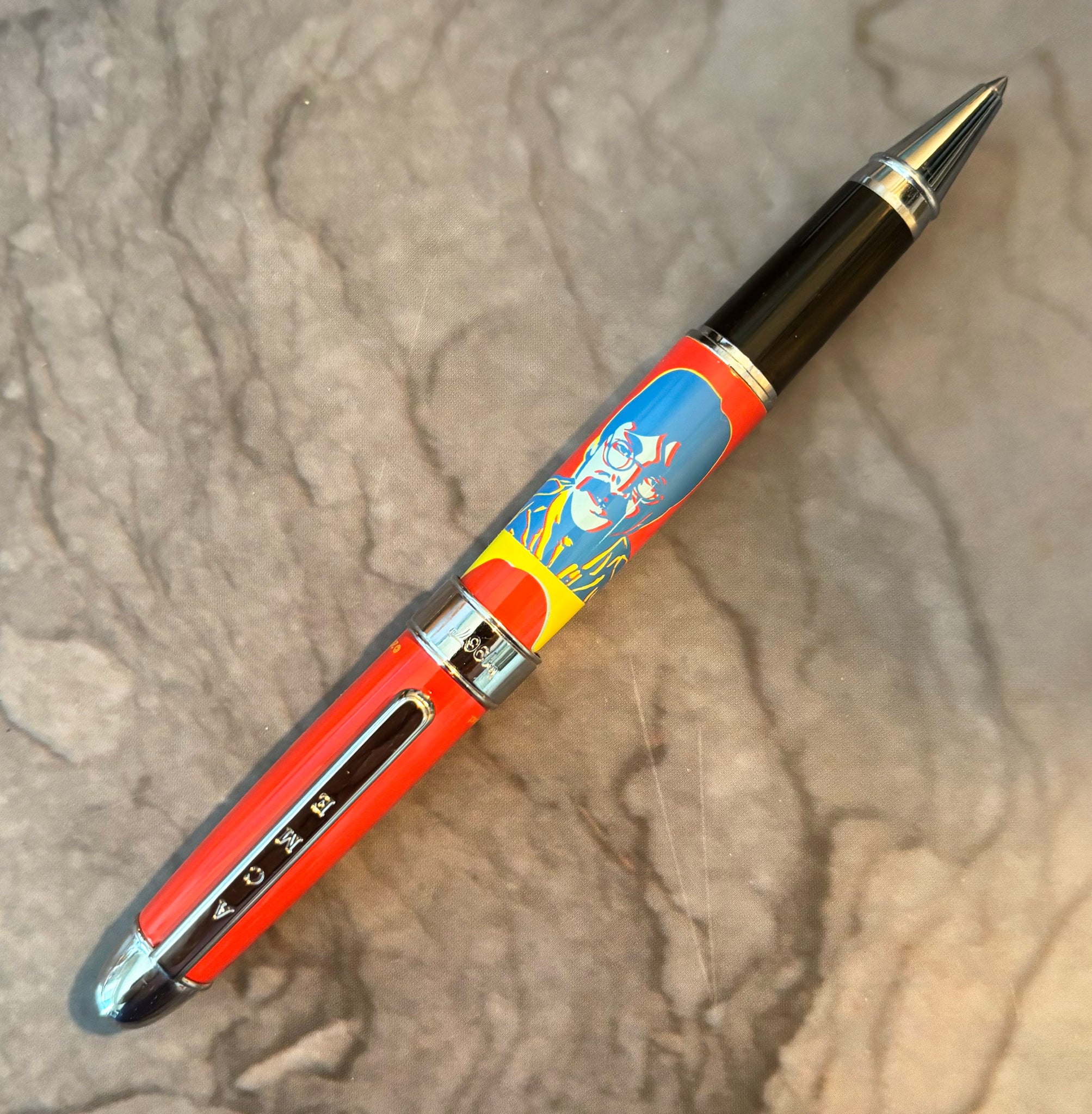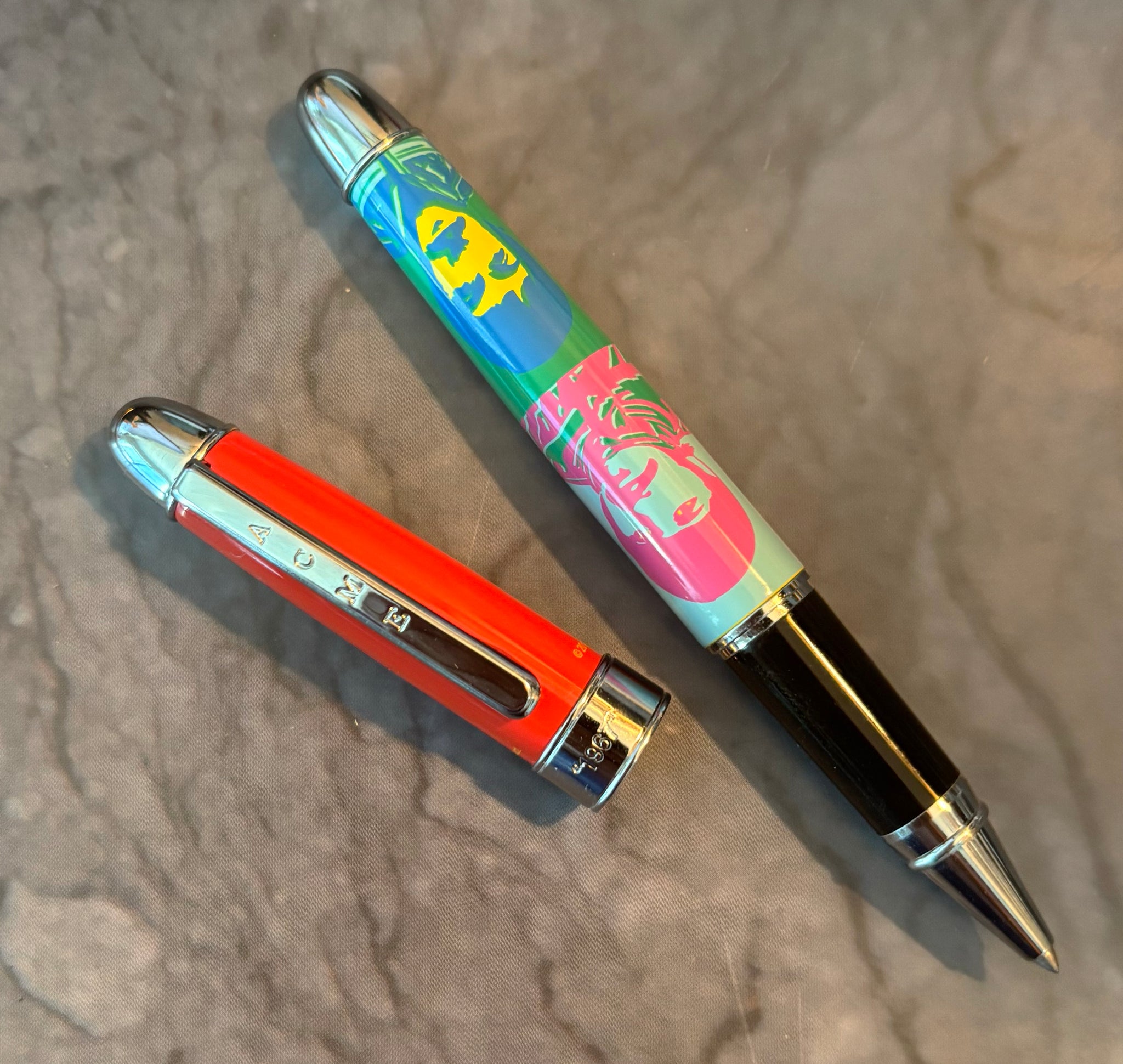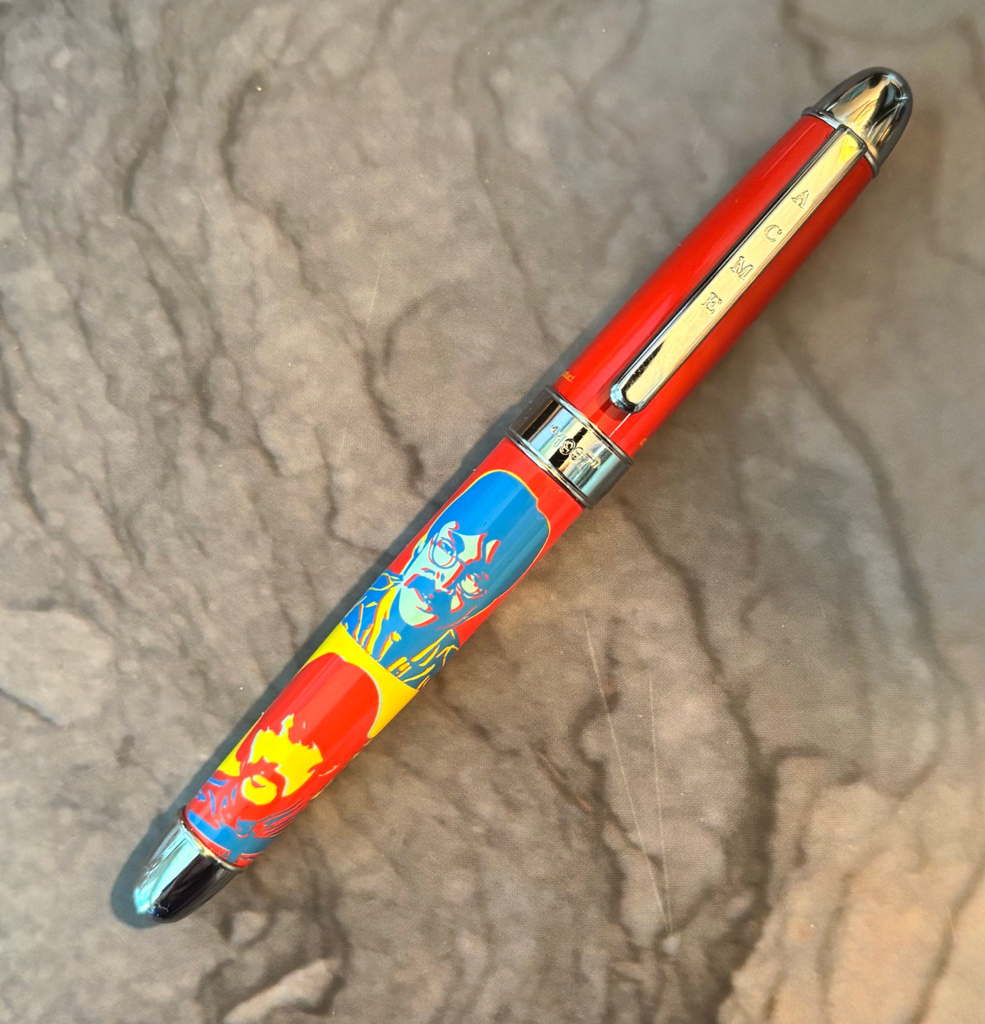 The pen is based on the classic stylings of Andy Warhol, using imagery from the "Sgt. Pepper's" era. Only 1,967 pieces will ever be made of this design. This pen comes equipped with a sealed ACME Roller Ball refill, and includes ACME Studio packaging. Packaging includes a black wooden ACME presentation box with a black sleeve and ACME Studio literature. This pen is also compatible to ACME's fountain pen converter.