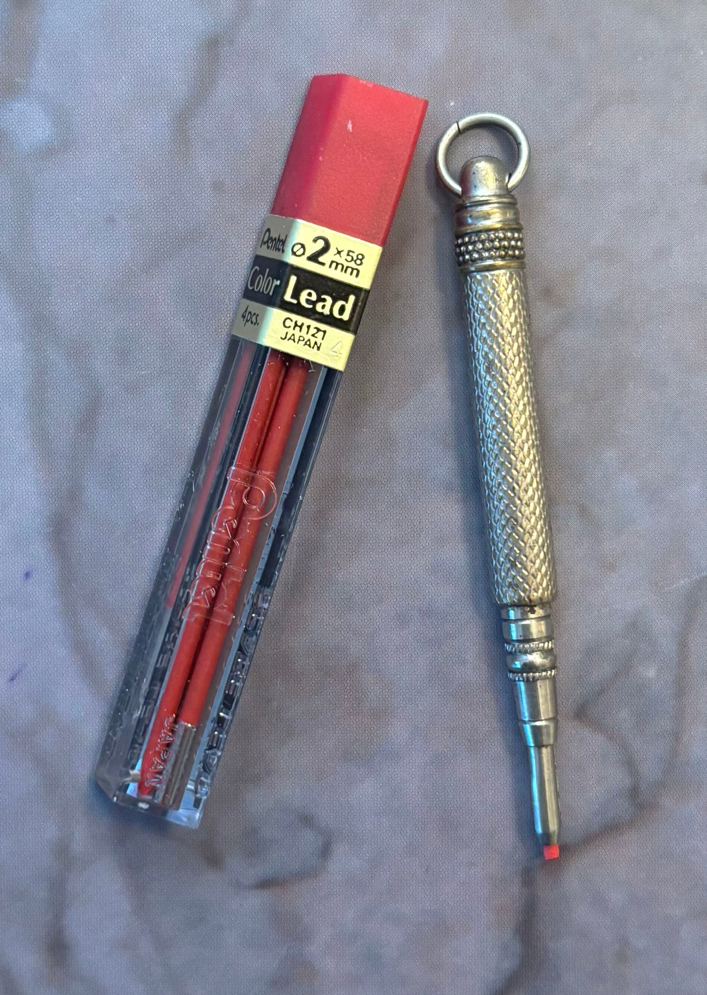 Victorian Pencil,19th Century, Ring-top, Propelling mechanism, Round Pencil, Nickel plated, engine turned pattern with beaded pattern at top.